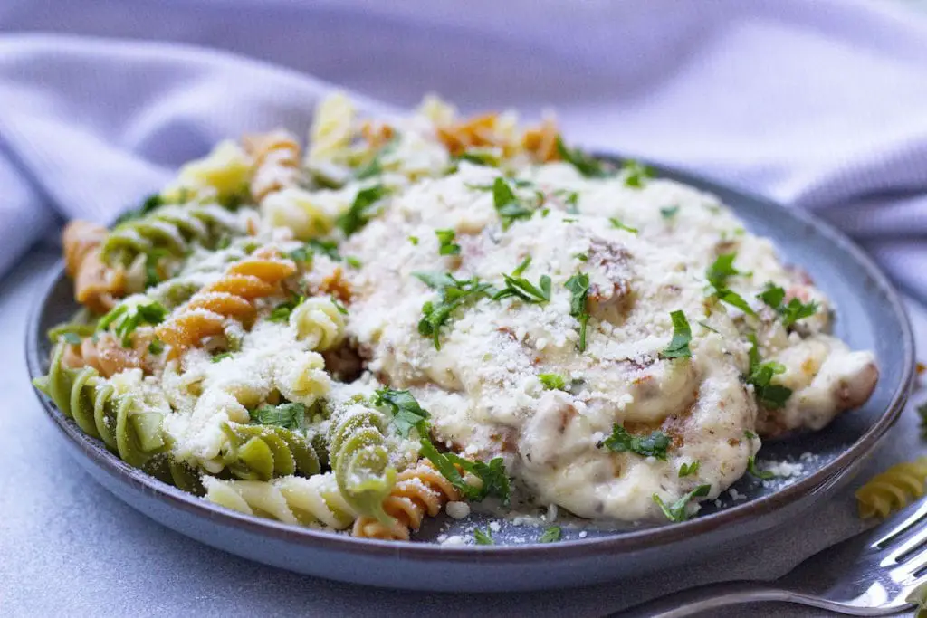 Es una de esas recetas que ya puedes suponer que están deliciosas: pasta cremosa de parmesano y pechuga de pollo jugosa.