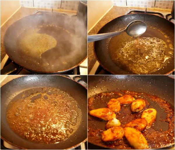 - Agrega el azúcar y las rodajas de plátano a la sartén y cocina hasta que se doren y caramelicen ligeramente.