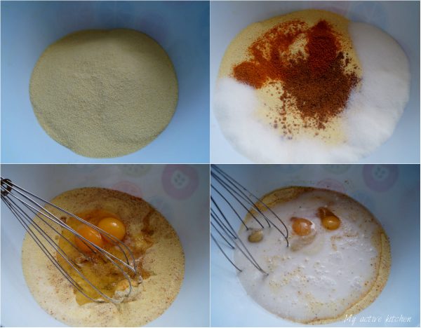 - En un recipiente, mezcla la sémola, la levadura en polvo y la sal.